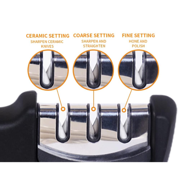 El afilador de cuchillos de acero es una herramienta manual diseñada para mantener o restaurar el filo de los cuchillos mediante el uso de ranuras con materiales abrasivos (como carburo de tungsteno, cerámica o acero). Es ideal para el uso doméstico y profesional en cocinas.