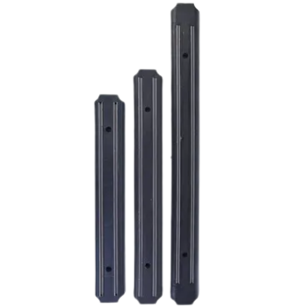Barra magnética revestida en polipropileno, diseñada para fijar cuchillos, utensilios metálicos o herramientas sobre una pared o superficie vertical. Ideal para mantener el área de trabajo organizada, segura y sin ocupar espacio en cajones.