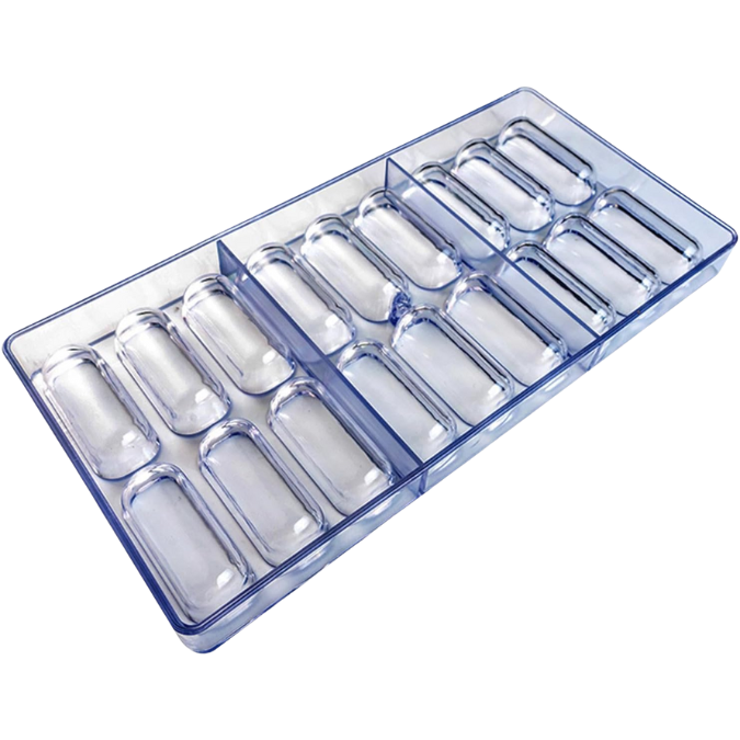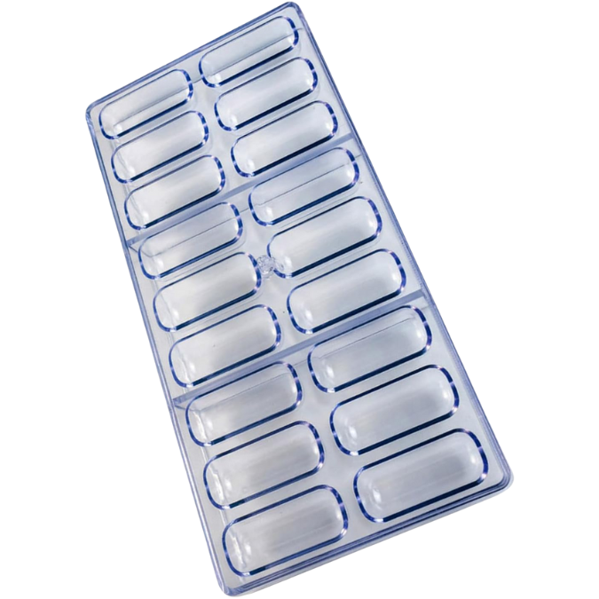 Crea chocolates tipo snack con una presentación elegante y profesional. Este molde de policarbonato estilo barra es perfecto para bombones alargados, barras pequeñas o chocolates con relleno.