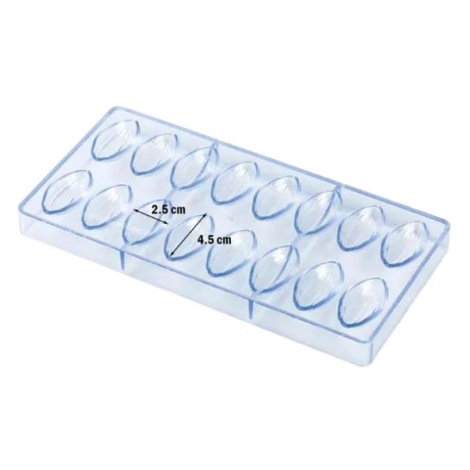 Elabora bombones únicos y elegantes con este molde profesional de policarbonato con forma de grano de cacao. Perfecto para chocolaterías artesanales o producciones gourmet, este molde proporciona piezas con acabado brillante y forma estilizada.