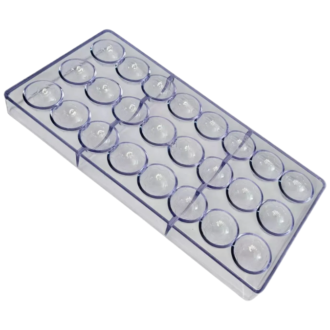 Este molde profesional de policarbonato rígido es ideal para la elaboración de chocolates artesanales con forma circular. Su diseño permite obtener piezas perfectamente redondeadas, lisas y brillantes, ideales para bombones, trufas o chocolates rellenos.