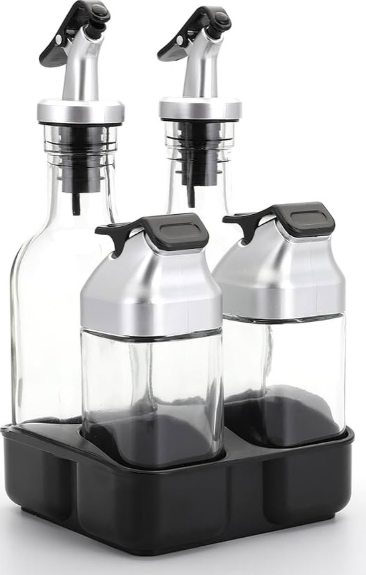 Este práctico set de cocina incluye dos aceiteras con dispensador y dos especieros con tapa dosificadora, todo montado en una base organizadora compacta. Su diseño moderno combina vidrio, acero inoxidable y plástico resistente para ofrecer funcionalidad, estilo y orden en tu cocina. Perfecto para tener a mano tus ingredientes favoritos como aceite, vinagre, sal, pimienta o especias.