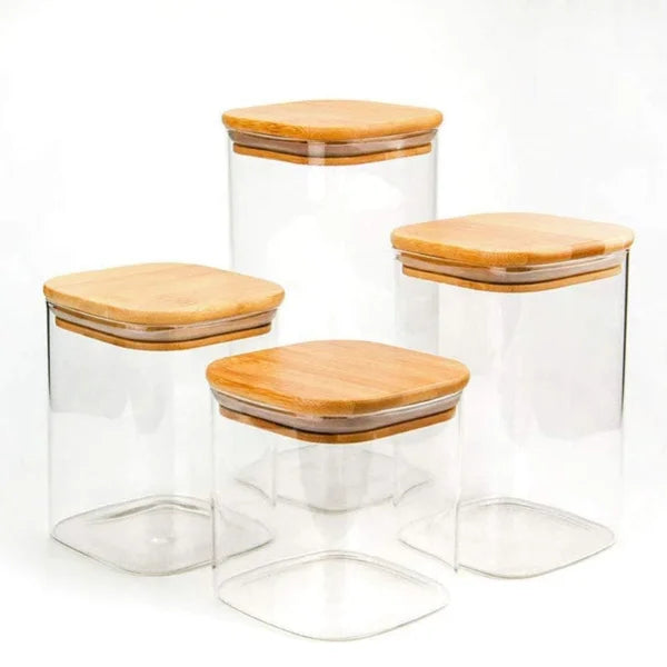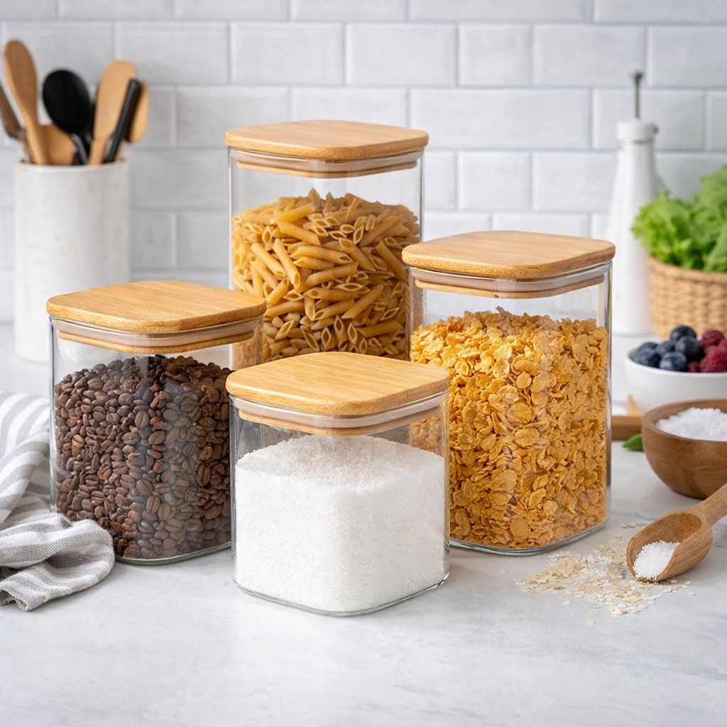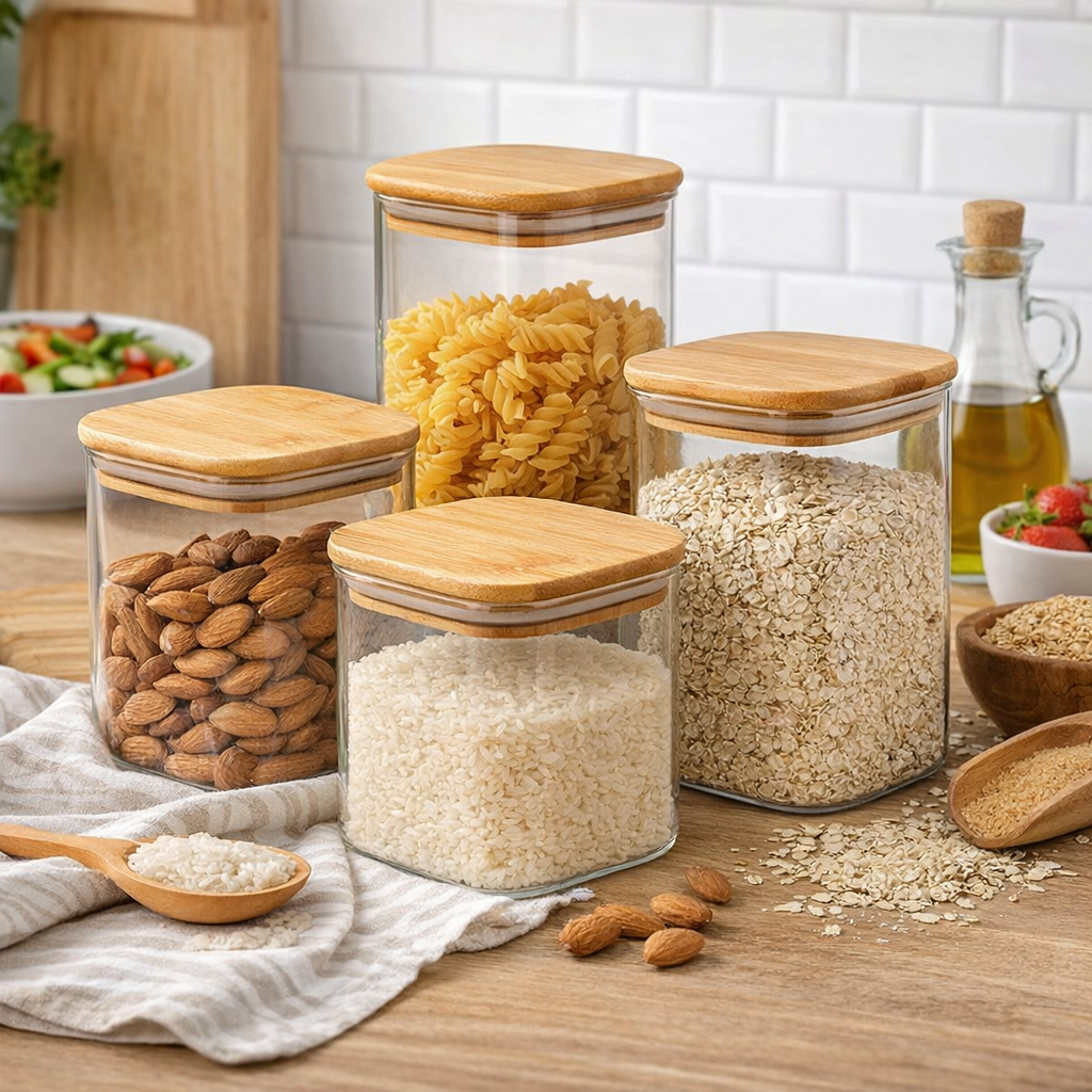 Tarro hermético de almacenamiento fabricado en material transparente de alta resistencia, con tapa de bambú natural y sello de silicona que garantiza un cierre seguro. Su diseño moderno y minimalista es ideal para organizar y conservar alimentos, aportando orden, frescura y elegancia a tu cocina.