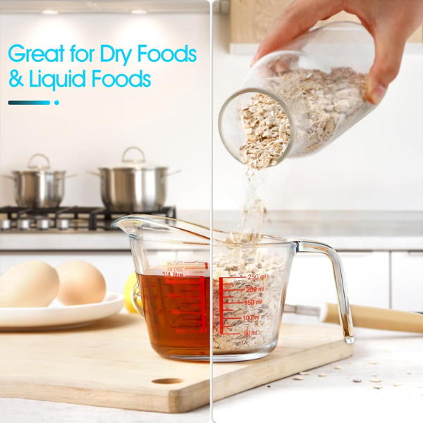 Taza medidora de plástico transparente con escala impresa en mililitros y onzas líquidas. Ideal para medir líquidos como agua, leche, aceite o ingredientes secos como harina y azúcar. Su diseño ergonómico facilita el vertido sin derrames.