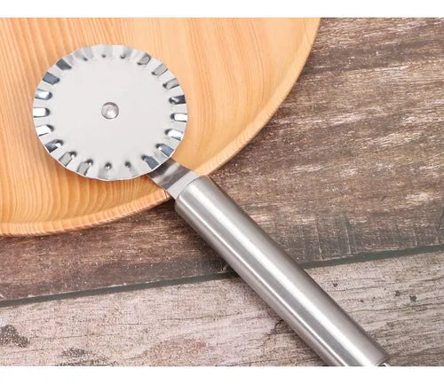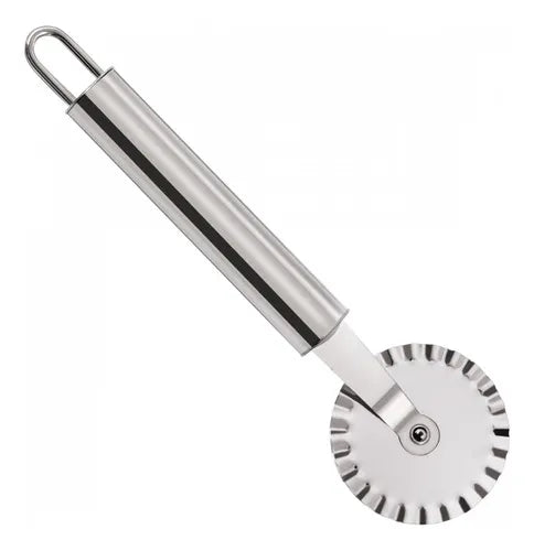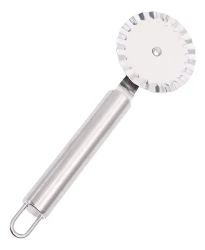 Cortador de masa en acero inoxidable con rueda ondulada, ideal para preparar y decorar bordes de empanadas, raviolis, galletas, pastas y diferentes preparaciones de repostería. Su diseño práctico permite cortes uniformes y decorativos de forma rápida y sencilla.