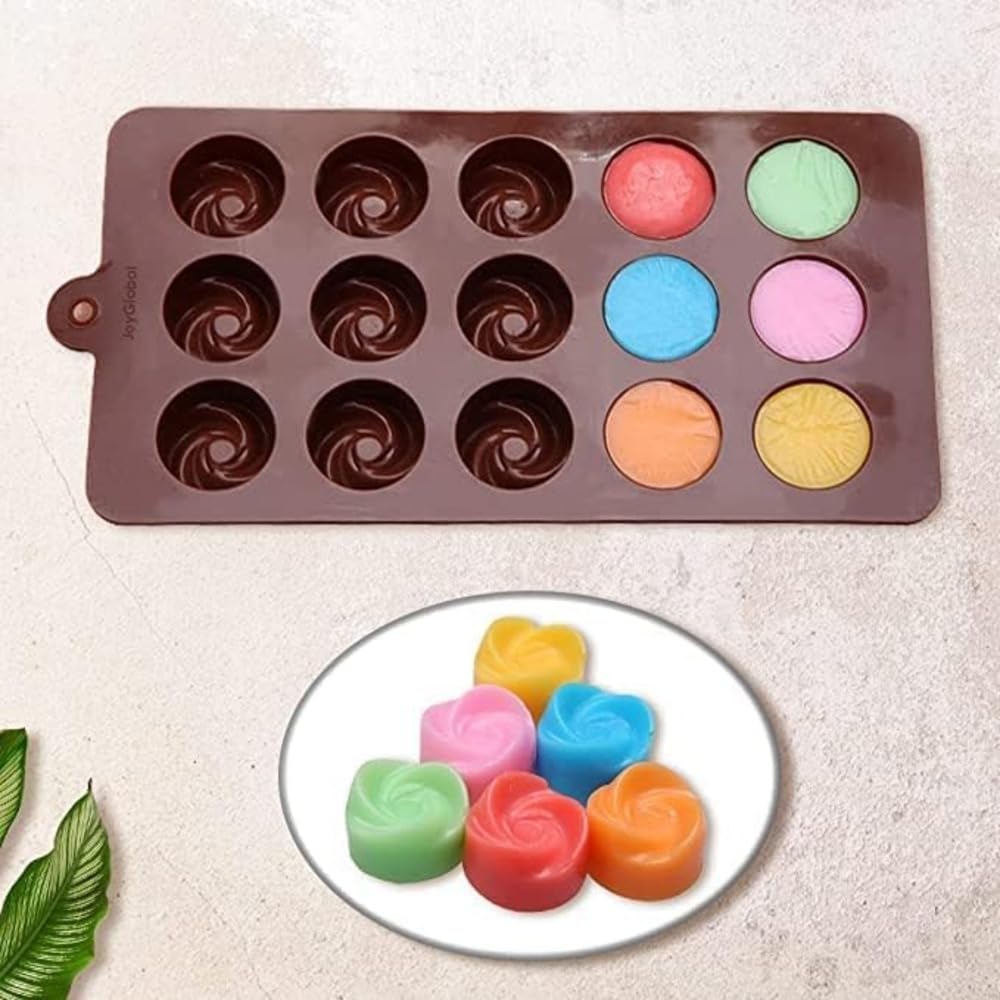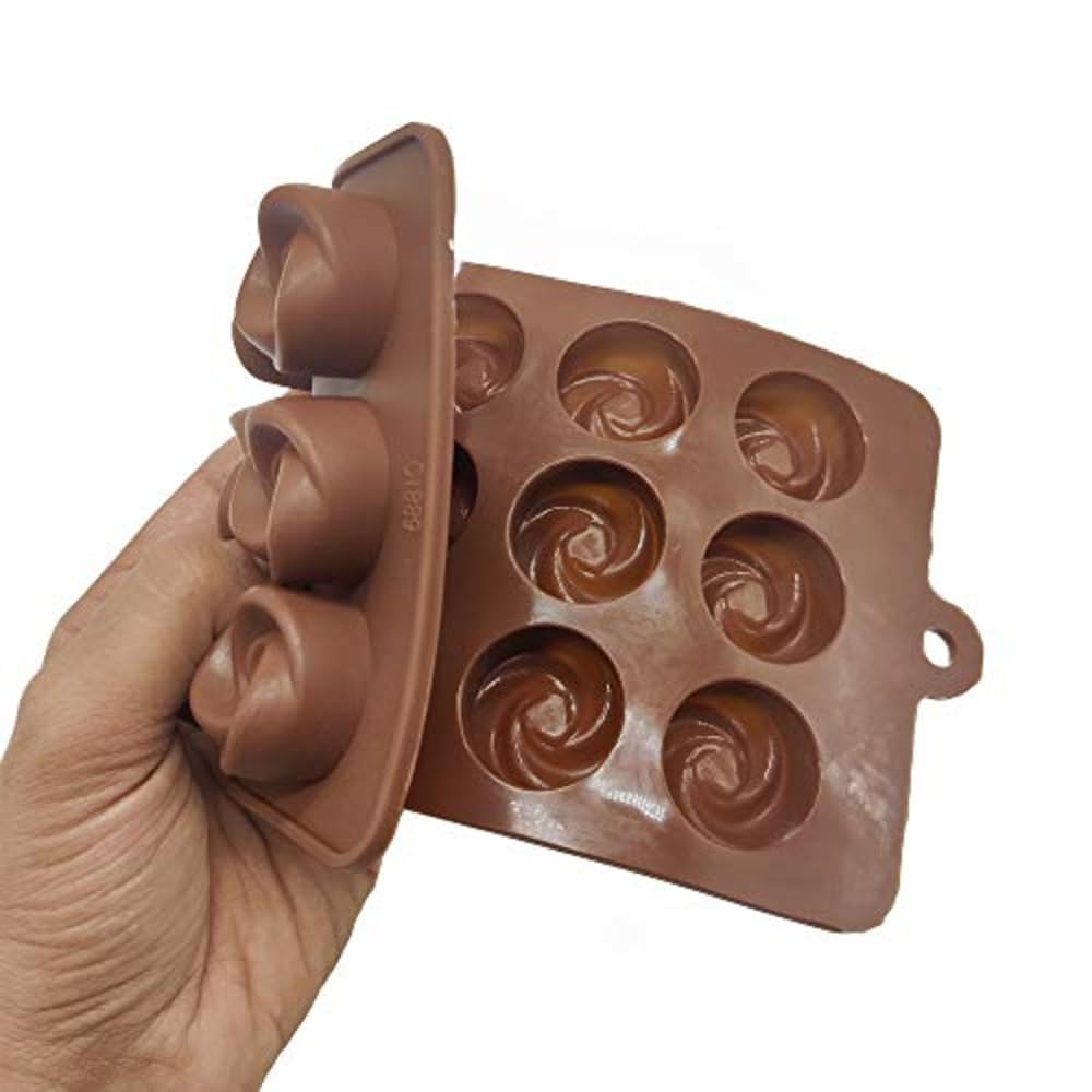 Molde flexible de silicona alimentaria con diseño de espirales, ideal para crear pequeñas porciones de chocolate, bombones, caramelos, gelatinas, gomitas o decoraciones para pastelería. Su estructura antiadherente facilita el desmoldeo sin necesidad de grasa adicional.